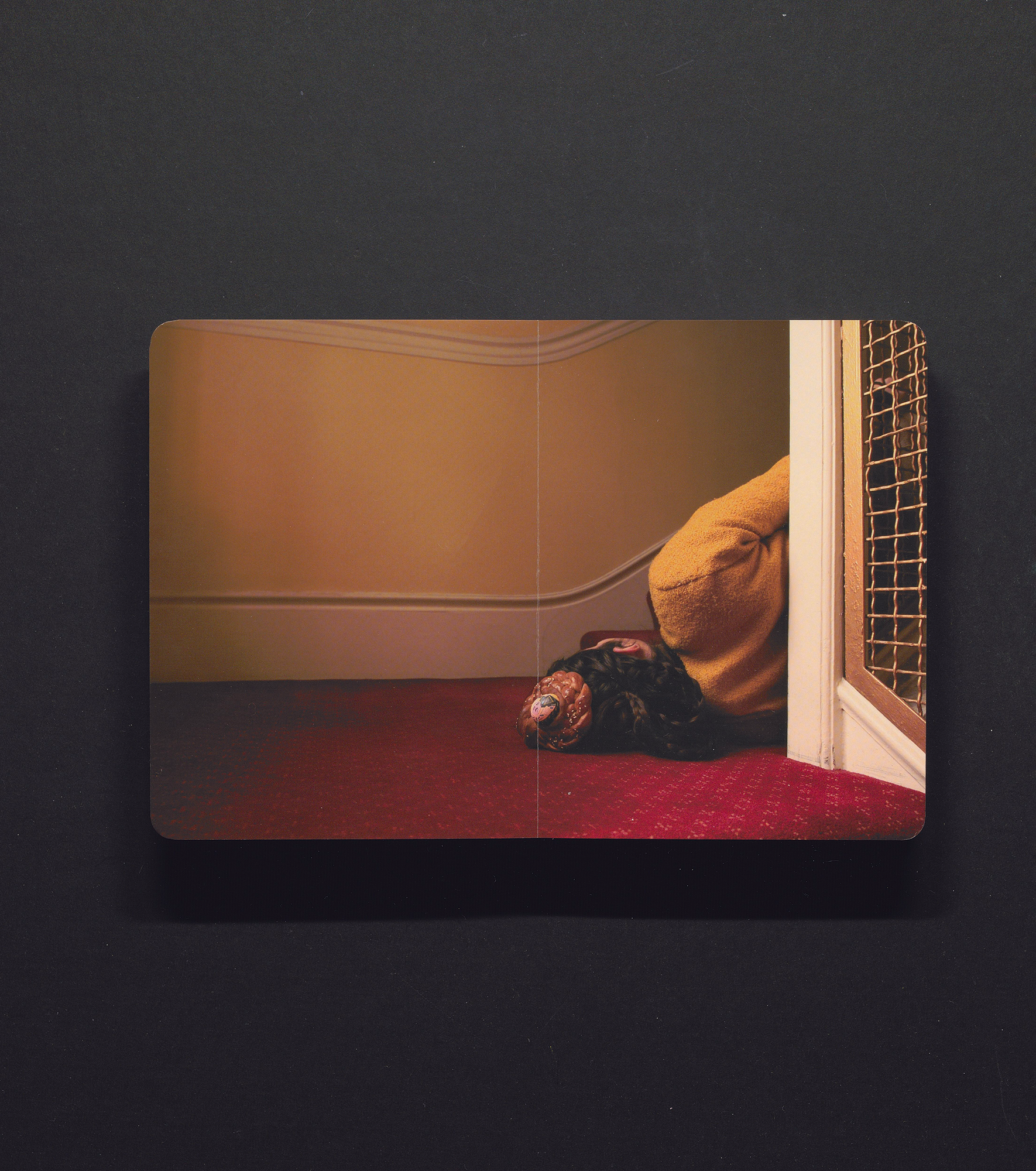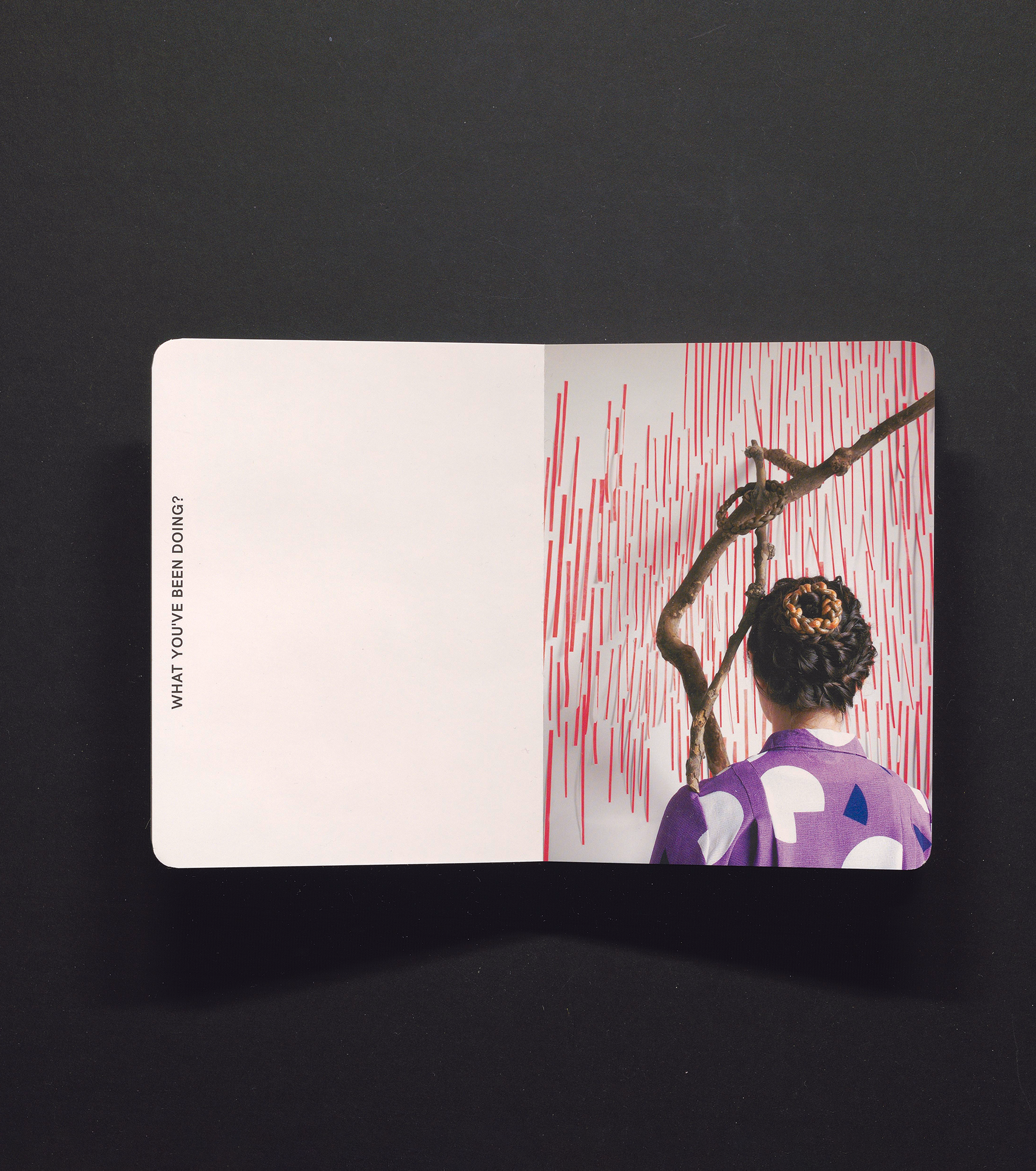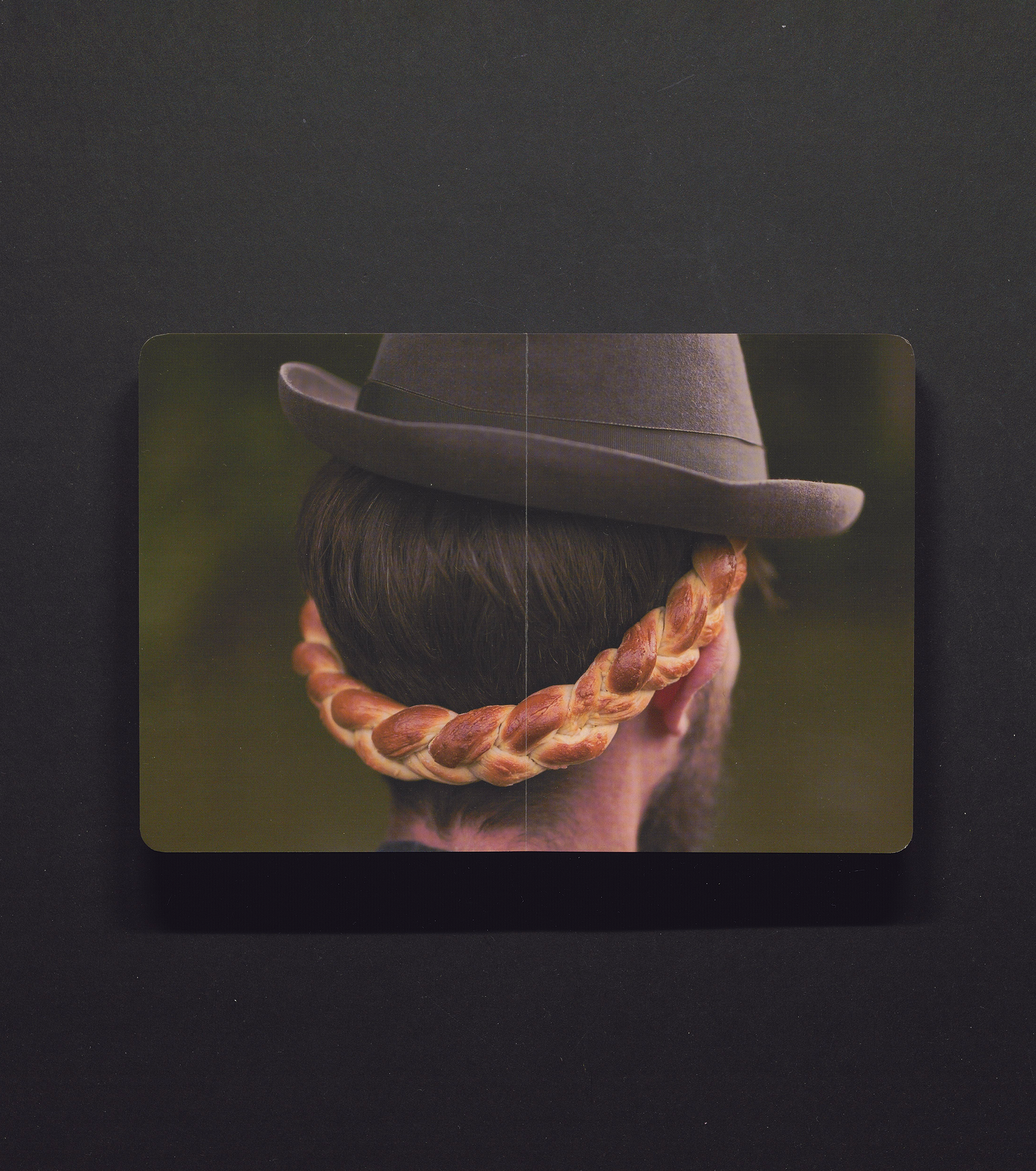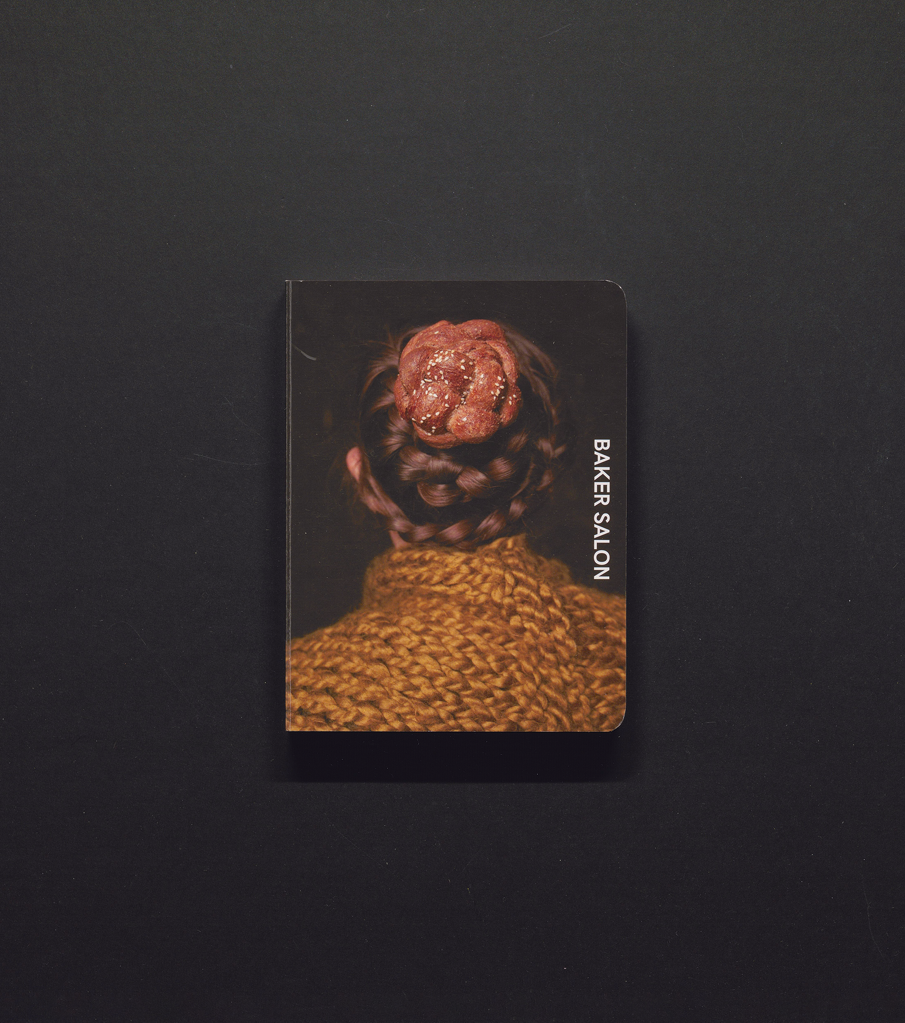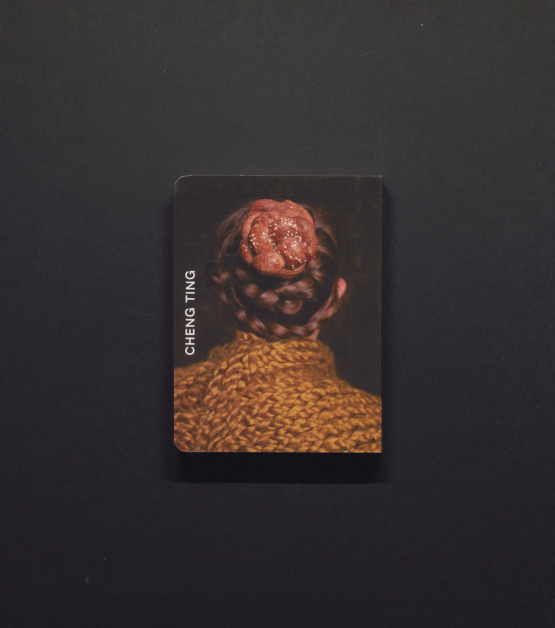 Cheng Ting’s Baker Salon is a playful publication of photography that features braided hair interspersed with braided bread. Several different heads were employed, the individuals sometimes grouped or alone, always with one or more pieces of braided bread woven into their braided hair styles. Baker Salon includes a visual index of each participant’s name and the back of their head. It is printed on hard back-board, which lends a childlike aesthetic and added durability.