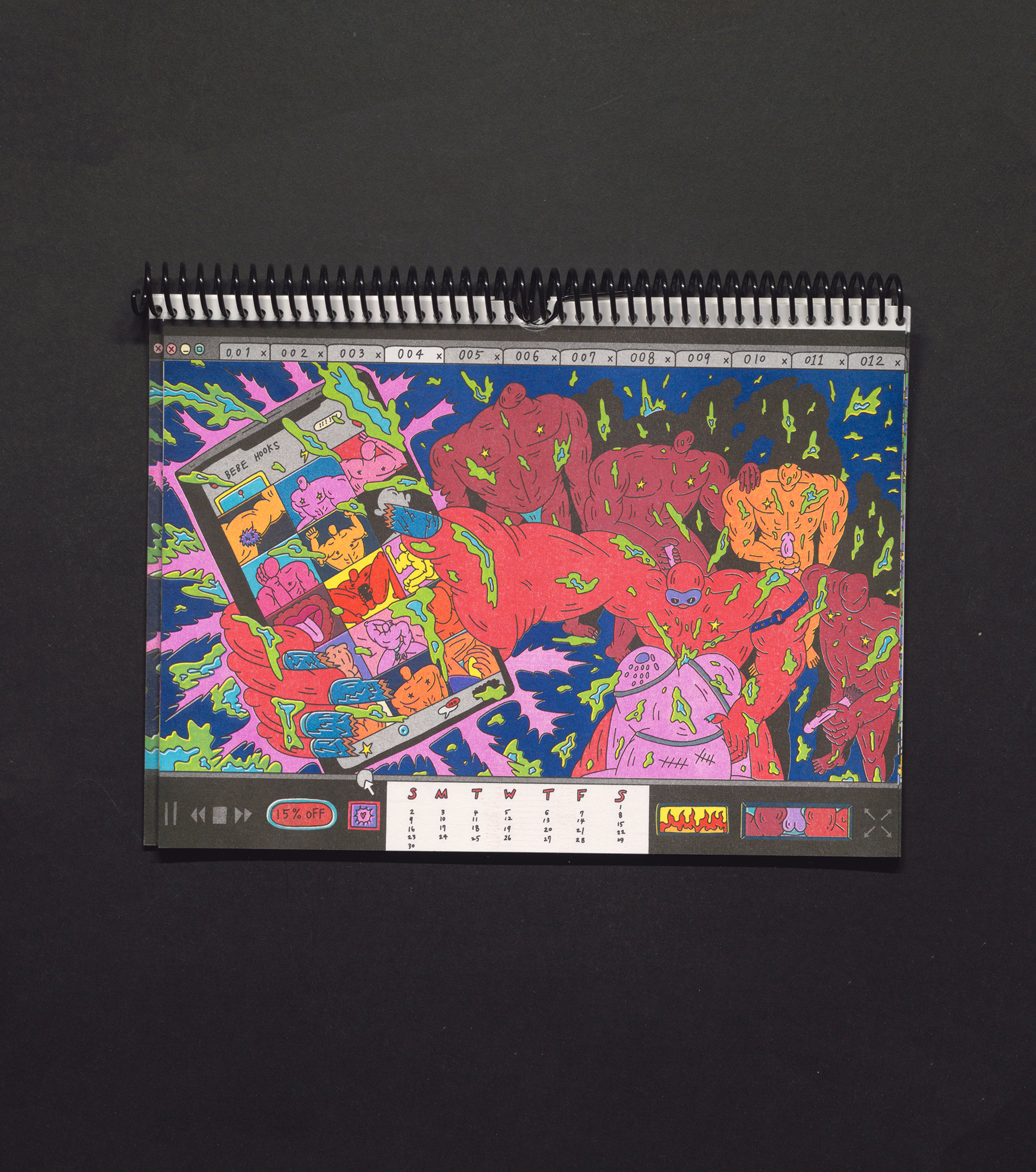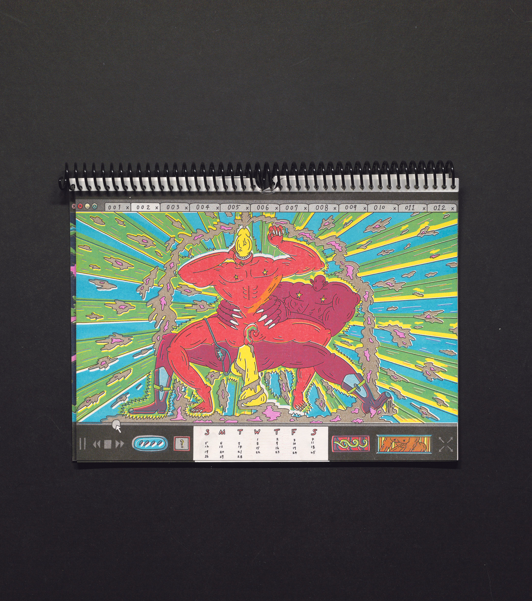 The calendar celebrates queer desire with a series of surreal pornographic illustrations. Pornography oftentimes serves as an introduction to sex when queer people discover their sexuality, sometimes as a tool for people to fulfill their emotional and sexual intimacy, and sometimes as a fantasy to escape from reality. Inspired by its versatility, we decide to give it an extra purpose this time: you can count every new day in the new year with these joyful naked bodies.