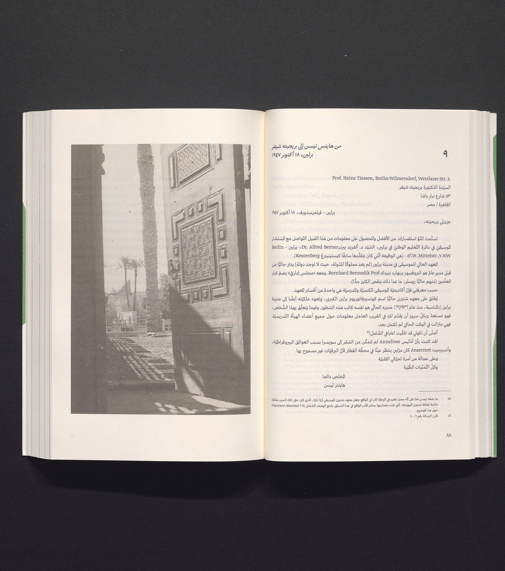 Born in Berlin in 1909, the composer, musicologist and educator Brigitte Schiffer fled Nazi Germany for Egypt in the mid-1930s, where she soon became one of the defining figures of Cairo’s musical culture. She directed a High School of Music, worked for the Egyptian Ministry of Education, and established a salon where artists and intellectuals gathered. Based on an annotated selection of her letters from that time, the publication makes her extensive correspondence with friends and colleagues in Germany available in Arabic for the first time. Illustrated with visual material from the guest book of Schiffer’s salon, the volume conveys a modern woman’s view of the cultural and social life of cosmopolitan Cairo in the mid-20th century in a way that is as informative as it is often humorous and touching. The Arabic translation by Mustafa al-Slaiman is based on the German publication of her letters edited by Matthias Pasdzierny, Dörte Schmidt and Malte Vogt (München 2017).