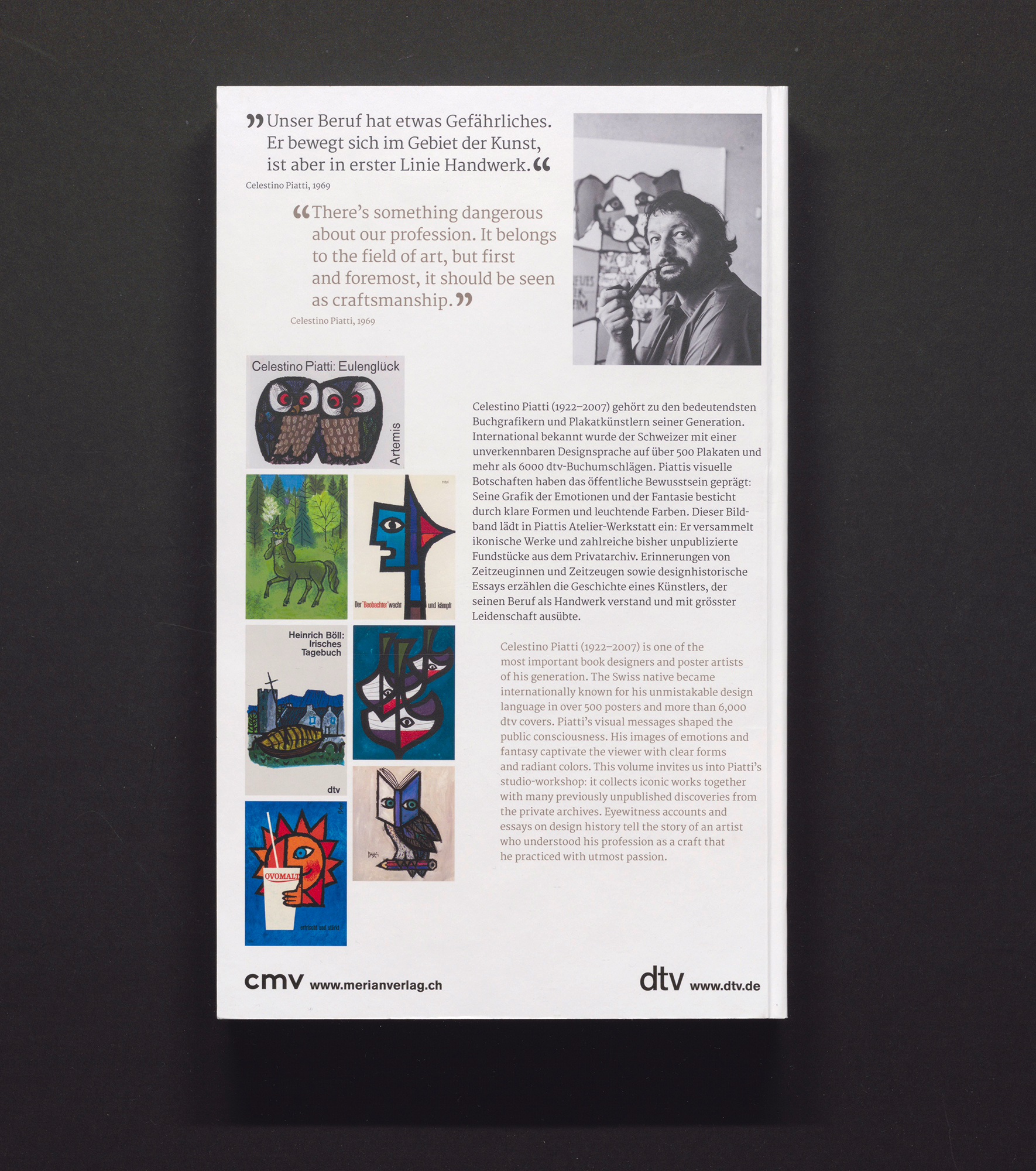 Eine solche Grafiker-Karriere gibt es nur einmal: Celestino Piattis (1922–2007) Bilder haben sich in das kollektive Bewusstsein eingeprägt. Besonders seine über 6000 Buchumschläge, die er von 1961 bis Mitte der 1990er-Jahre für den Deutschen Taschenbuch Verlag gestaltet hat, seine unverkennbaren Plakate und seine in viele Sprachen übersetzten Kinderbücher waren prägend für mehrere Generationen von Leserinnen und Lesern. Piatti hat aber auch Gemälde, Lithographien, Illustrationen und Skulpturen geschaffen, die Teil seines ideell wie auch materiell reichhaltigen künstlerischen Erbes sind. 2022 wäre Celestino Piatti 100 Jahre alt geworden. Das Jubiläum bietet Anlass, sein einzigartiges Oeuvre in einem Bildband zu würdige.
