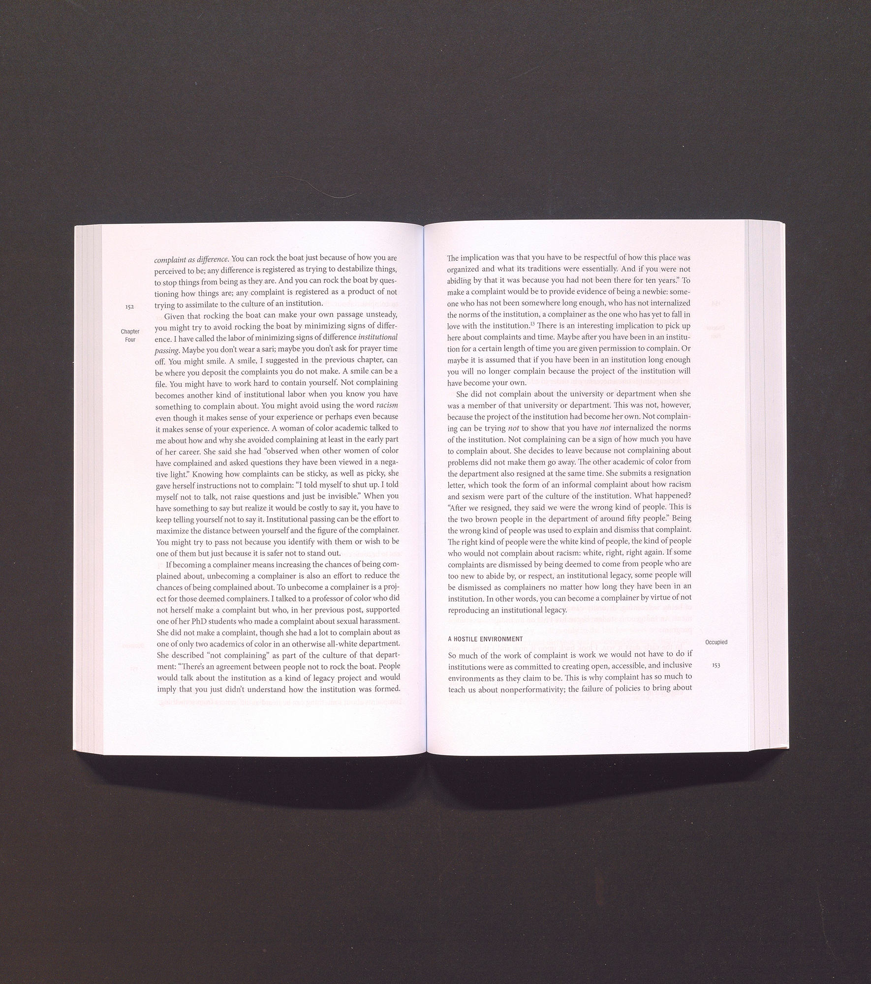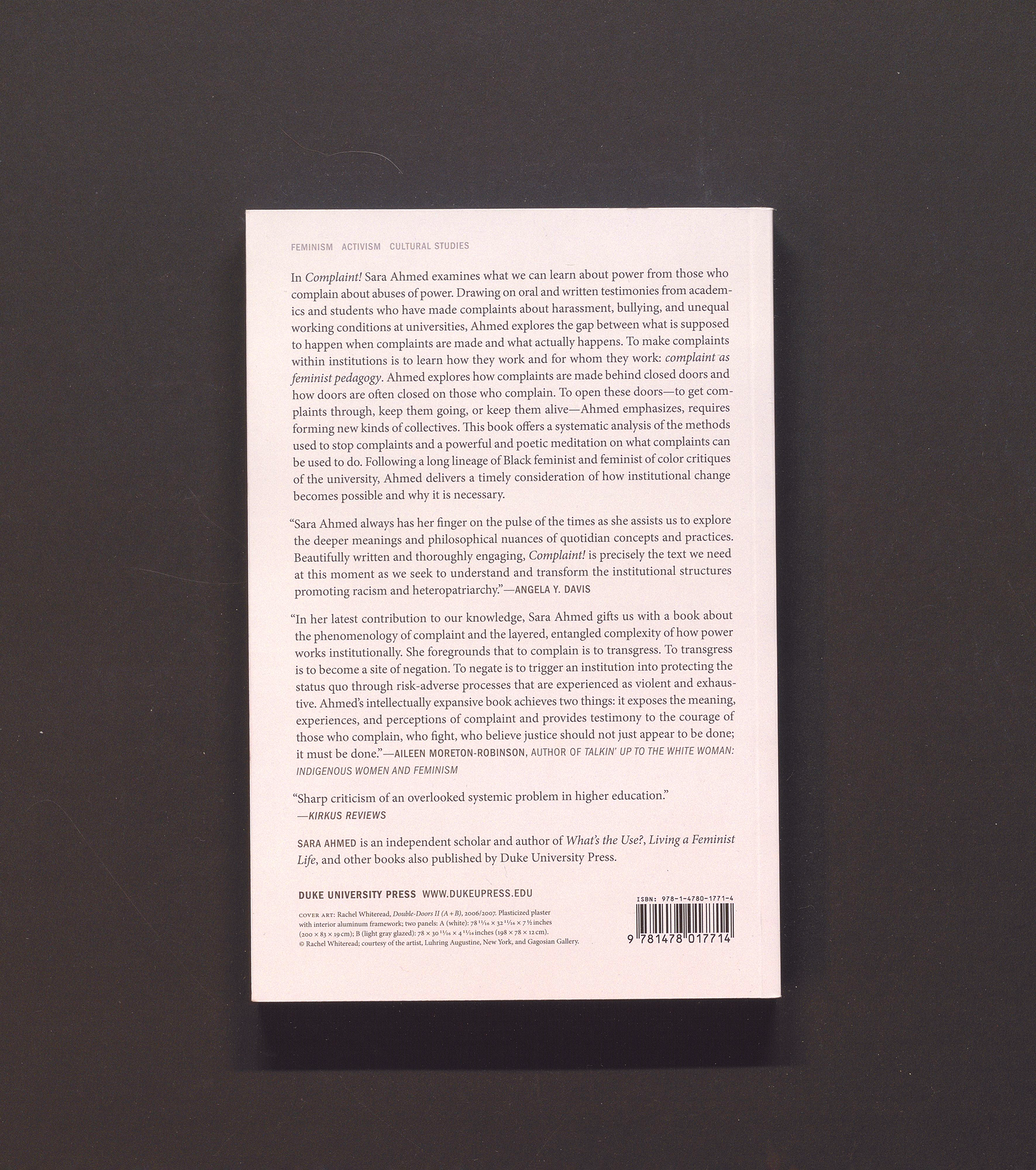 In Complaint! Sara Ahmed examines what we can learn about power from those who complain about abuses of power. Drawing on oral and written testimonies from academics and students who have made complaints about harassment, bullying, and unequal working conditions at universities, Ahmed explores the gap between what is supposed to happen when complaints are made and what actually happens. To make complaints within institutions is to learn how they work and for whom they work: complaint as feminist pedagogy. Ahmed explores how complaints are made behind closed doors and how doors are often closed on those who complain. To open these doors---to get complaints through, keep them going, or keep them alive---Ahmed emphasizes, requires forming new kinds of collectives. This book offers a systematic analysis of the methods used to stop complaints and a powerful and poetic meditation on what complaints can be used to do. Following a long lineage of Black feminist and feminist of color critiques of the university, Ahmed delivers a timely consideration of how institutional change becomes possible and why it is necessary.