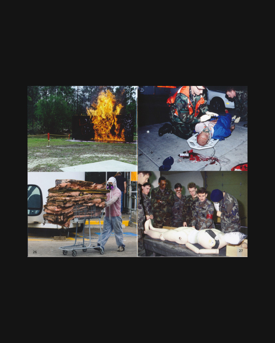 Hazmat happenings. Terrorist cosplay. Flaming cars. Bloody dummies. Fake wounds on real people. Mannequin driving a school bus. Hostage-taker takeover. Stabbing practice. Are these people training to save us or kill us? Welcome to the frequently strange and unsettling world of U.S. Department of Defense training photographs. I collected and arranged these unrestricted images over the last few months during the anxious times of the COVID-19 pandemic. They were selected from thousands of photographs using the Digital Public Library Archive (https:// dp.la). The photos themselves are maintained by the National Archives at College Park in College Park, Maryland. The images come from a series created and compiled or maintained between 1982-2007. They are presented here without context to create a space of reflection. Full metadata can be found by searching https://catalog.archives.gov. This is the first issue of Library Excavations to depend entirely on internet archives due to public library closures or limited in-person access during the pandemic. As COVID-19 continues with no clear end in sight, publications in this series will likely continue to emerge from the safety of quarantine: my internet-connected basement bunker in Chicago. I have to say, I miss the sensation of touching paper in a public building. I’m tired of worrying and scrolling. — Marc Fischer