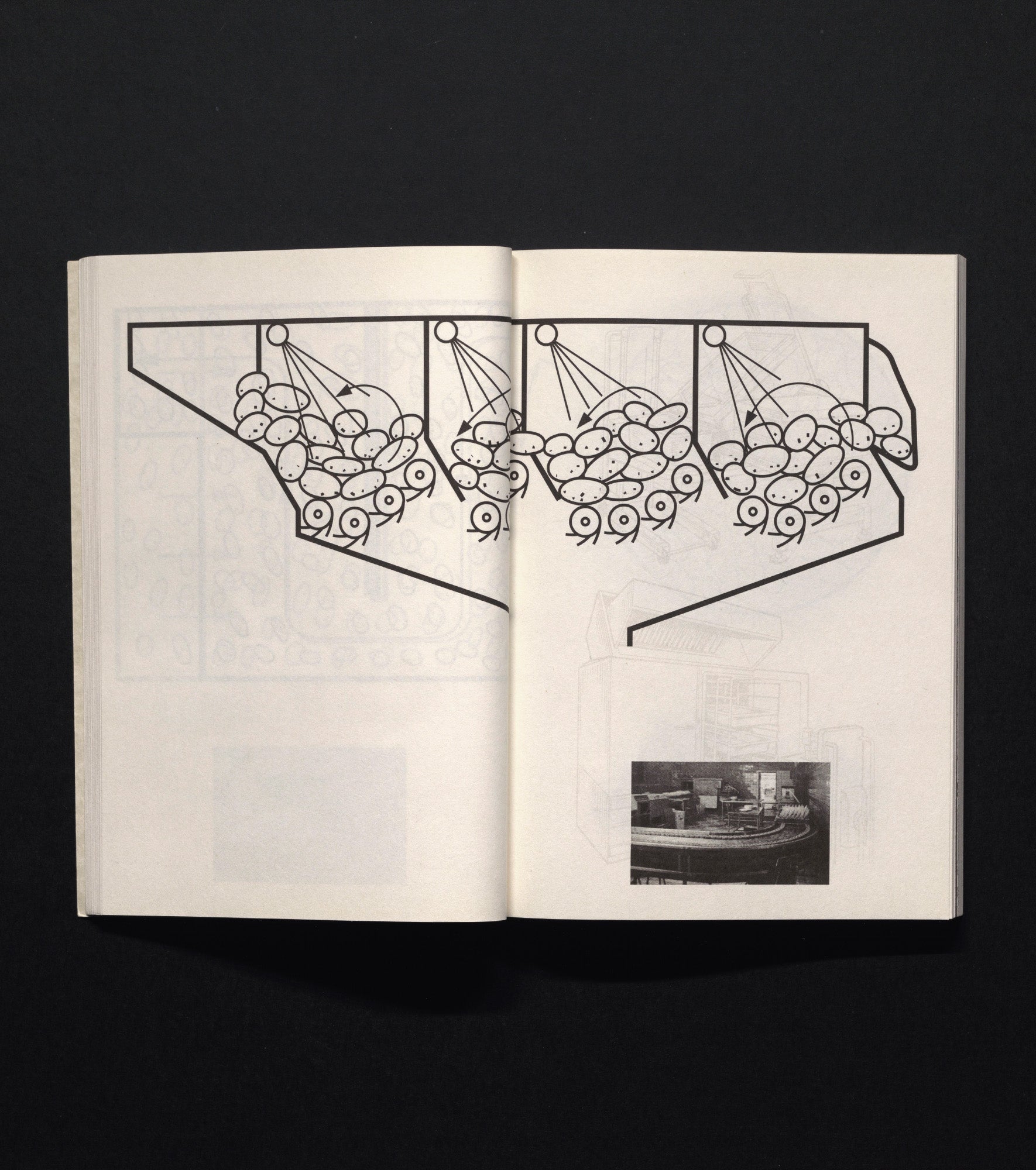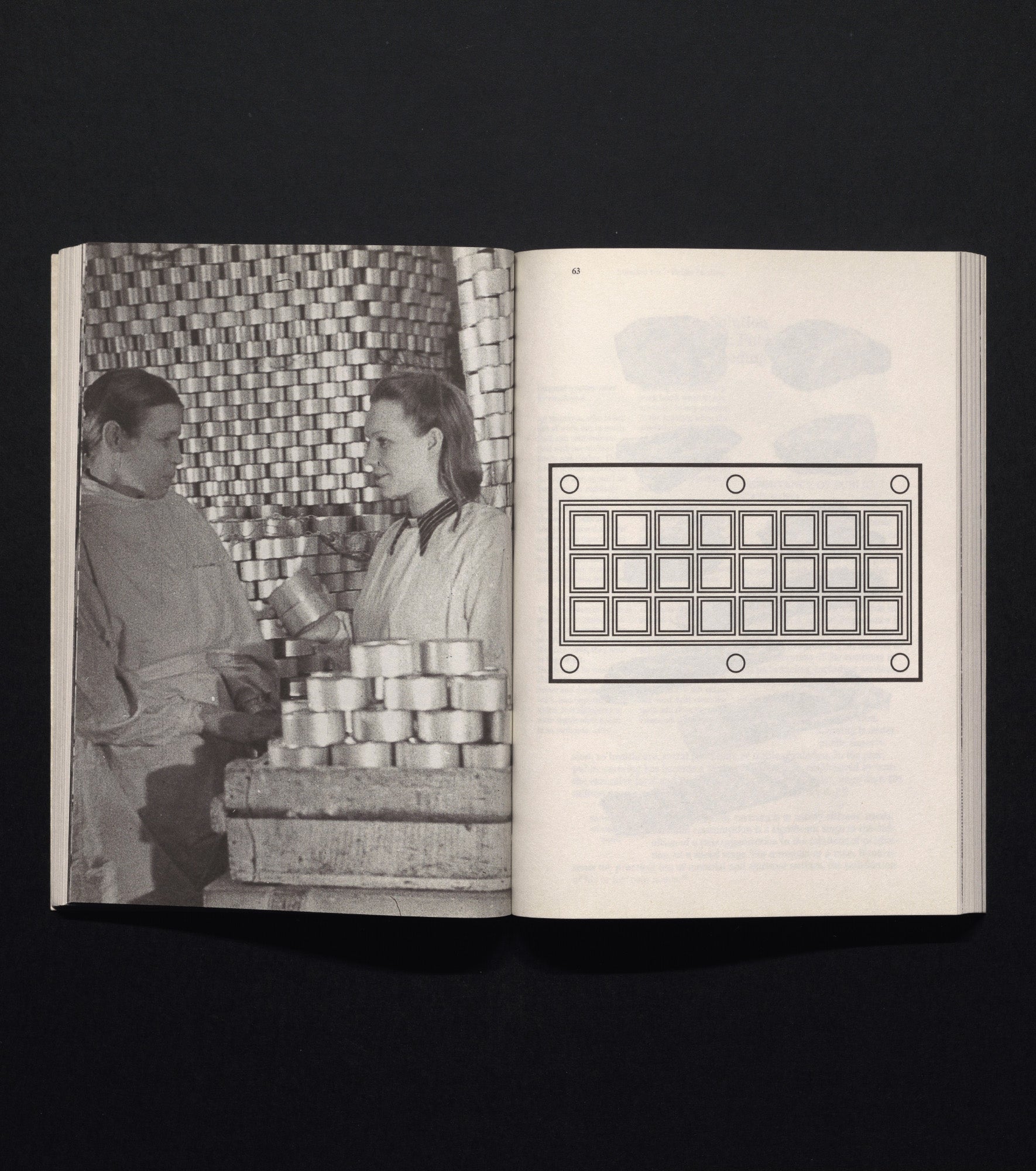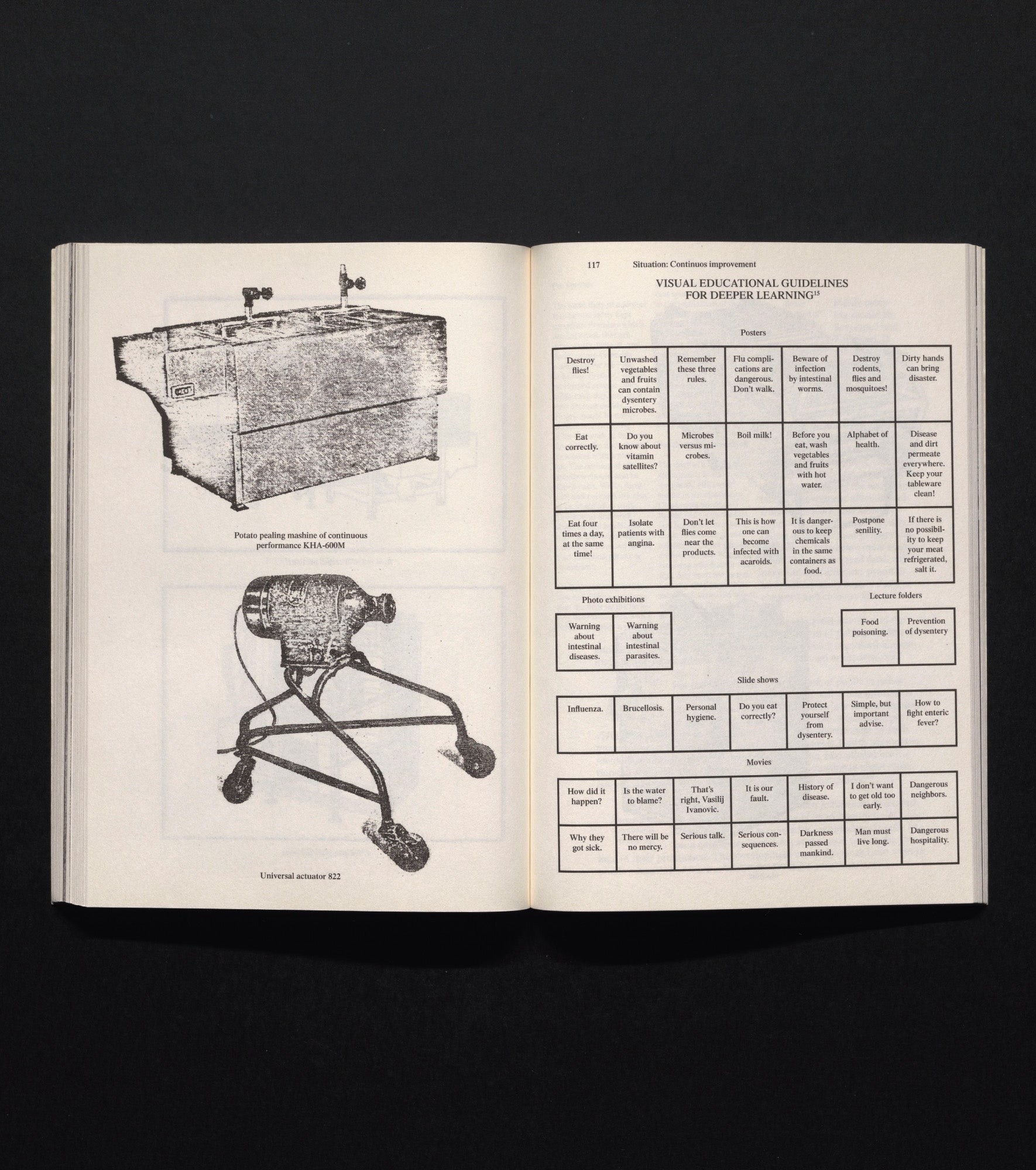 On continuous and systematic nutrition improvement is a continuation of Indre Klimaite project and publication Canteen Guide 2009. It is a narrative of human culture within a system. It is insider view that lifts sheets to ideology mechanism, it’s propaganda and practice. This publication extends history and itself becomes a plan for tomorrow. Research itself is based on textual and visual materials collected from Soviet public catering books between 1935 until 1990. Material spans over a broad range of documents, from official sanitation memorandum to archeological photographs, from women liberation slogans to dishwashing instructions, from technical plans for the classification of potatoes to dinner room schemes, from soviet gastronomy recipes to sanitary norms and measures to fight rodents and microbes. Human life as a never stopping potatoes washing machine.