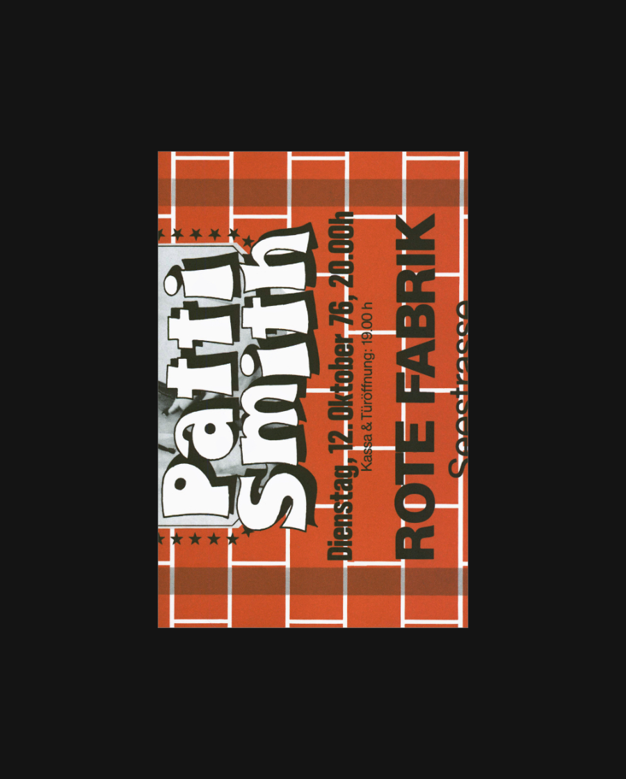 On October 12, 1976, Patti Smith performed at the Rote Fabrik in Zurich until the concert was interrupted by a mysterious tear gas attack. A bootleg recording from that evening is the starting point for Dominik Bachmann’s research and this attractively prepared photo book. The book brings together unpublished photos by Eric Bachmann, François Bitzi, and Roland Stucky, and also makes available for the first time, an interview that Smith gave to Swiss television. The numerous finds are supplemented by historical documents, newspaper articles, and texts by Bice Curiger, Veit Stauffer, Peter K. Wehrli, Suzanne Zahnd and Corine Mauch complement the historical finds.