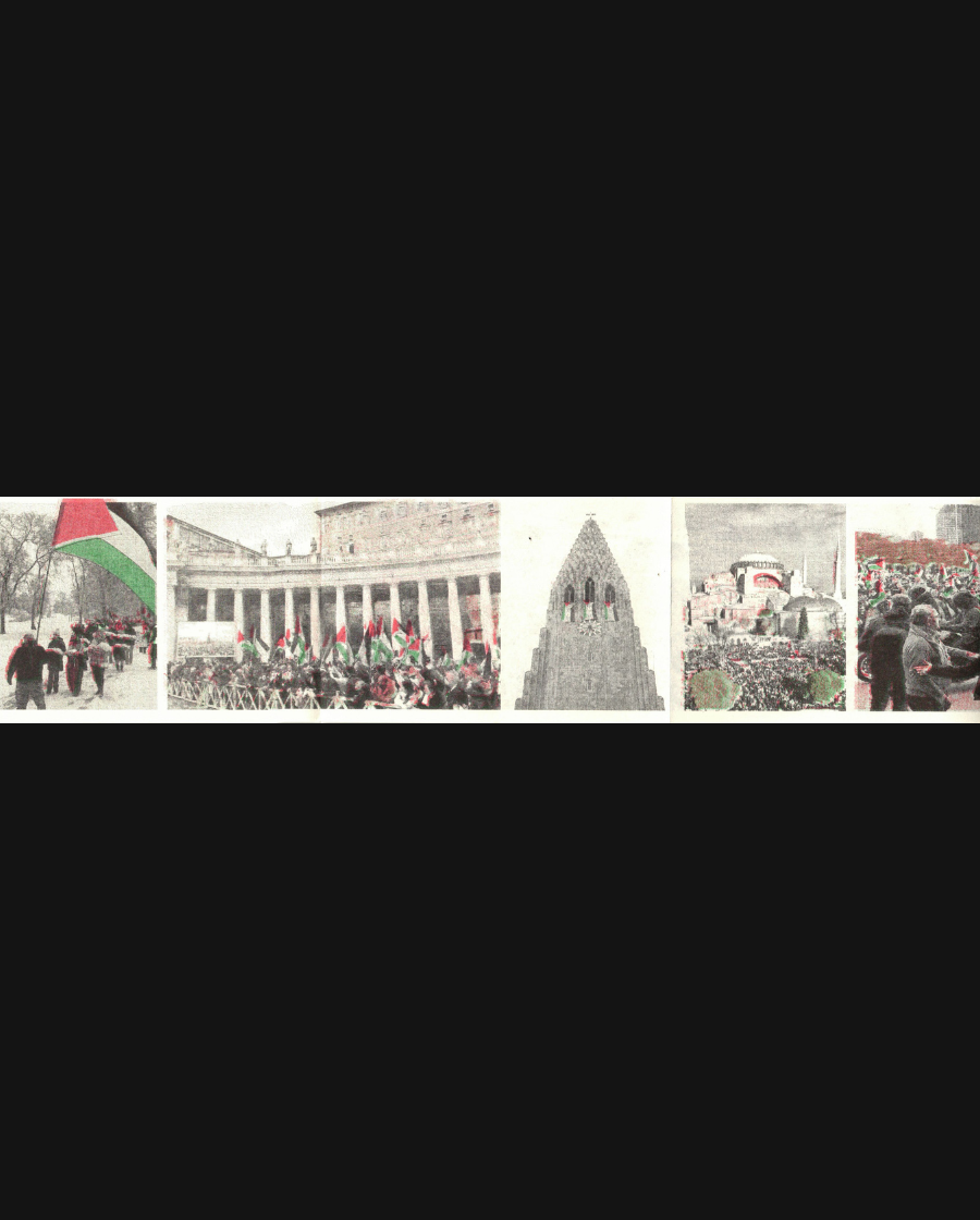 A foldout printed publication with different scenes of solidarity for Palestine, across the world.