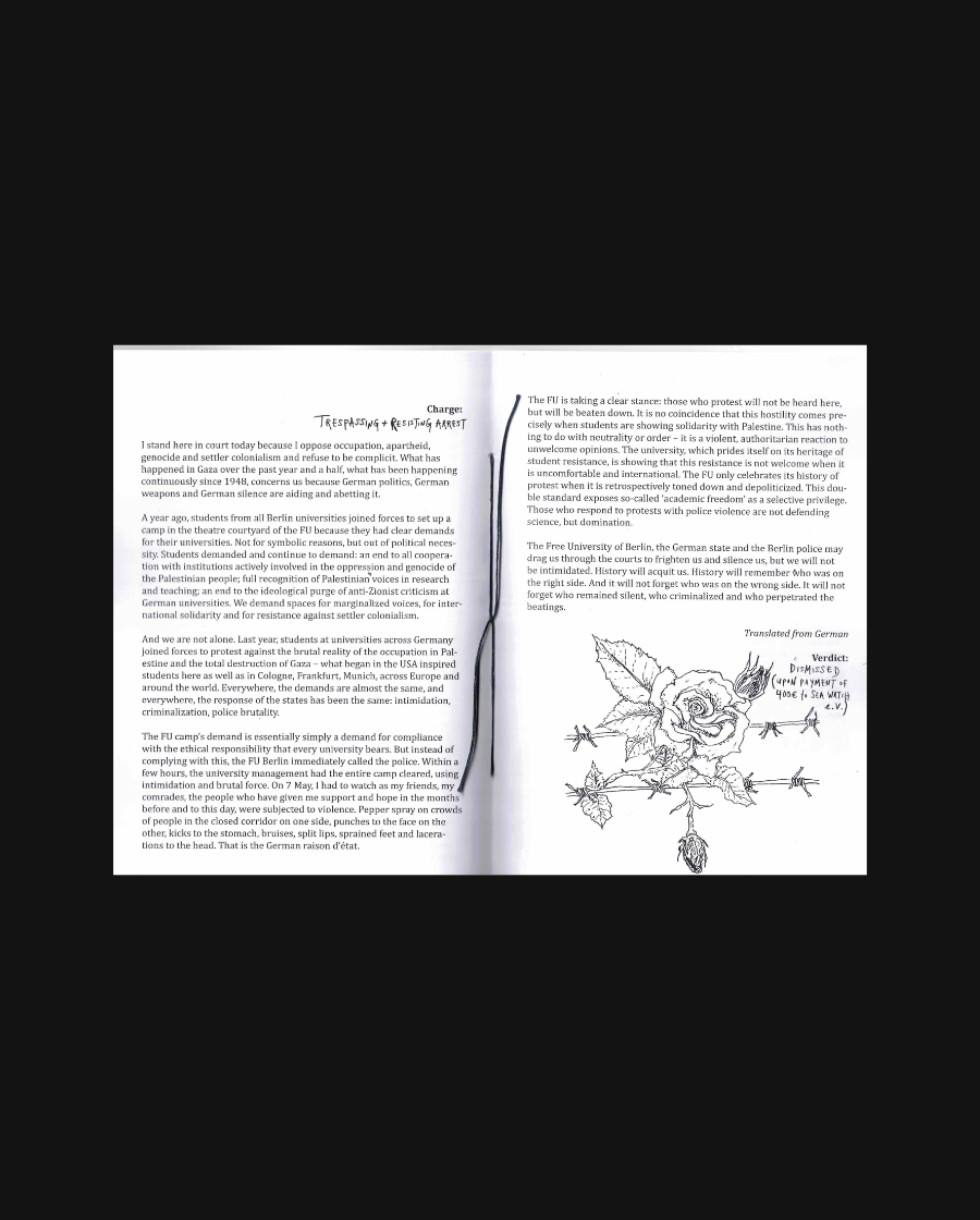 Facing the judge and the prosecutor, students reiterate the reasons behind their interventions. In their statements, originally presented in English, German, and Spanish, students emphasize not only their right to protest, but also their moral responsibility to disrupt business as usual at their institutions, given the universities’ complicity in the ongoing genocide. In response, judges frequently interrupt students, insisting such speeches belong not in the courtroom, but lecture halls and seminar rooms, disregarding the very reasons for which students are being criminalized.